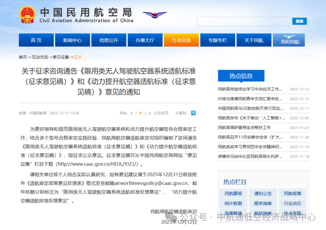 最新政策动态:民航局航空器适航审定司于2025年12月12日发布了《限用类无人驾驶航空器系统适航标准(征求意见稿)》和《动力提升航空器适航标准(征求意见稿)》,目前正在向社会公开征求意见,意见反馈截止时间为2025年12月31日。